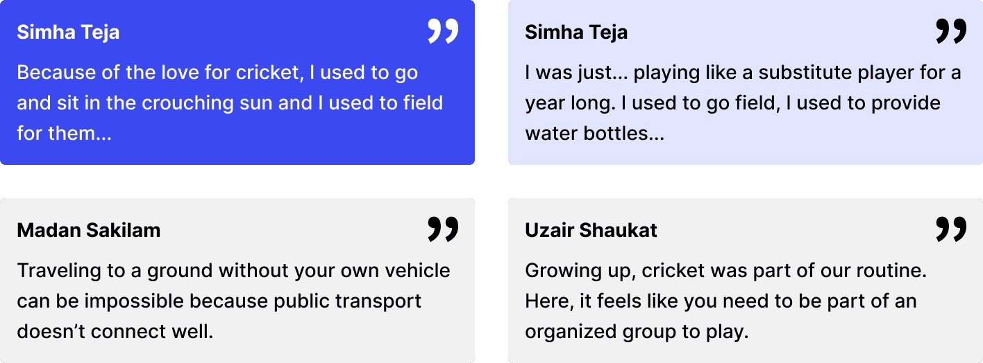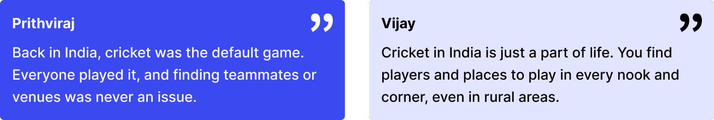 Designing Cricket in the States was more than solving a usability problem. It was about addressing identity, belonging, and cultural continuity. For South Asian immigrants, cricket is not just a game, it is a piece of home. Creating a system that makes it accessible in America is a step toward inclusion and community.
